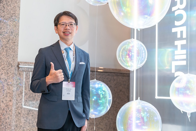 圖:許哲豪醫師在醫學會展示PROFHILO逆時針特色。